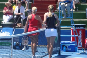 Jessica Moore (left) and Olga Govortsova head off court. TENNIS AUSTRALIA