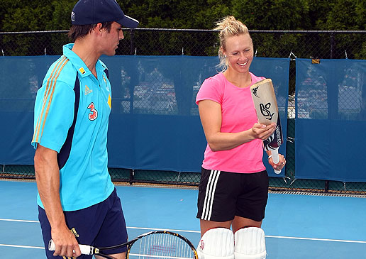 Alicia Molik gets a feel for the cricket bat.