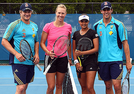 Left to right: Shane Watson, Alicia Molik, Sania Mirza and Mitchell Johnson before their exhibition match.