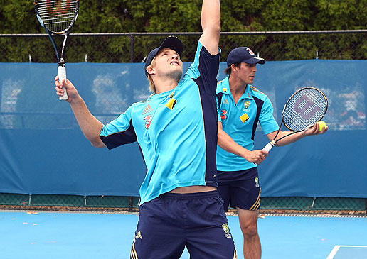 Shane Watson (left) and Mitchell Johnson practice their serves.