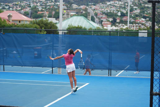 Estela Cabez Candela (ESP) serving against Nina Bratchikova (RUS). Credit: Kaytie Olsen