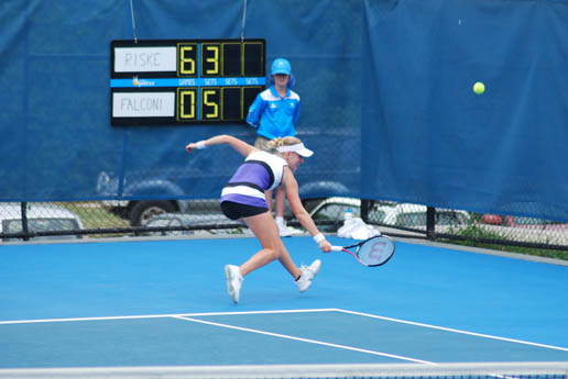 Alison Riske returning a hit from Irina Falconi. Credit: Kaytie Olsen