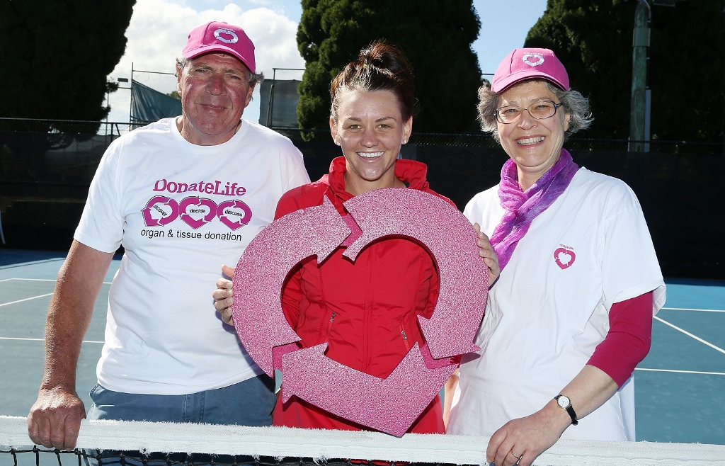 Australian tennis star Casey Dellacqua, middle, with organ transplant recipients David Taylor and Heather Nicholls. Picture: Getty Images