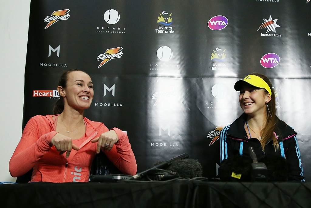 Martina Hingis and Belinda Bencic talk to media ahead of their 2014 Moorilla Hobart International exhibition match. Getty Images.