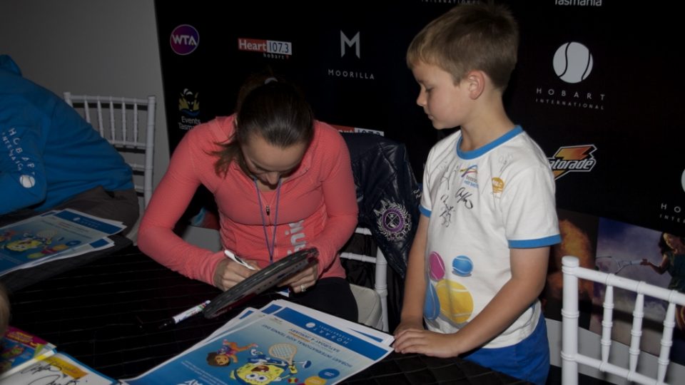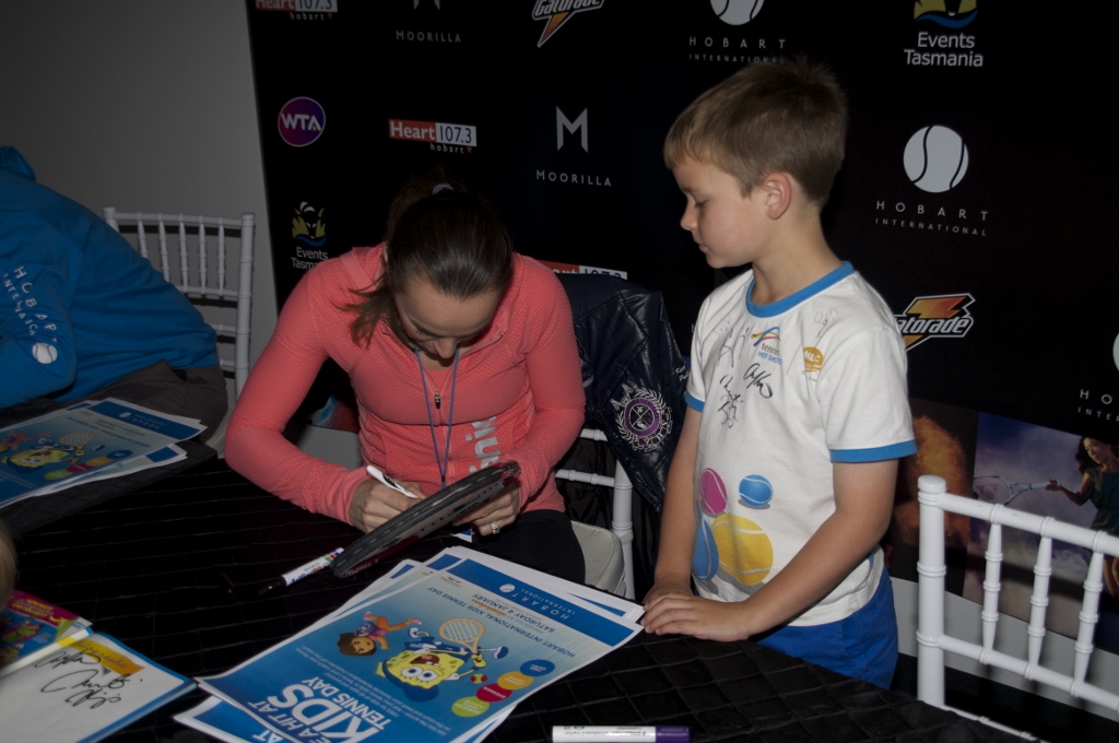 Martina Hingis signs an autograph for a fan at the 2014 Hobart International