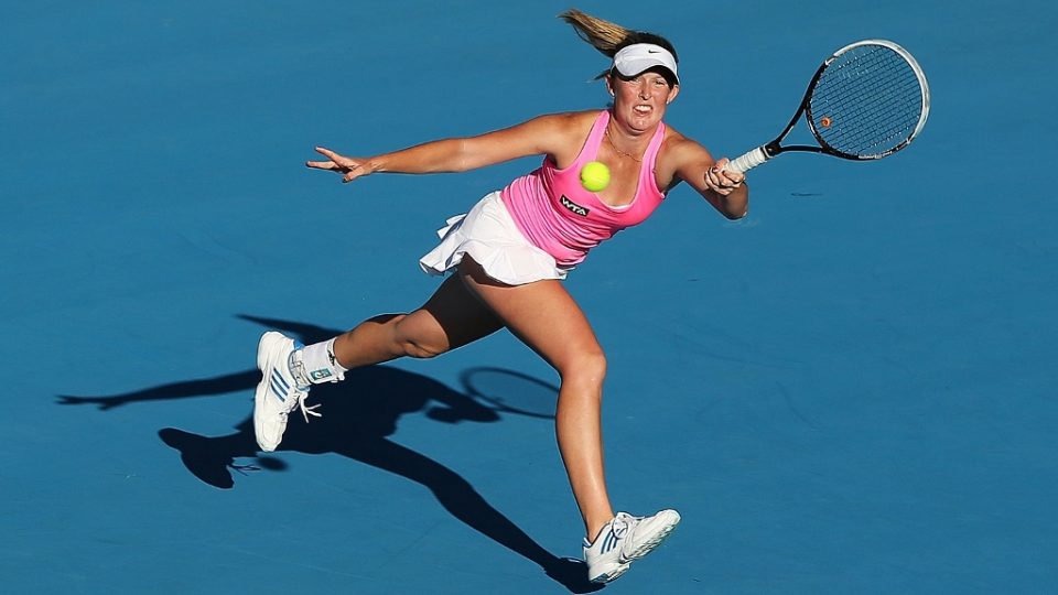 Australian wildcard Storm Sanders stretches for a forehand in her marathon second round. Picture: Getty Images