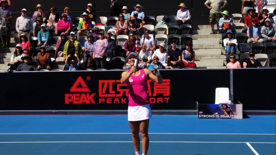 A happy Samantha Stosur hits prizes donated by The Old Woolstore Apartment Hotel into the crowd after her win. Picture: Casey Gardner