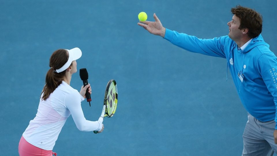 Ever seen a one-handed serve? Martina Hingis shows how it is done with the help of tournament director Mark Handley