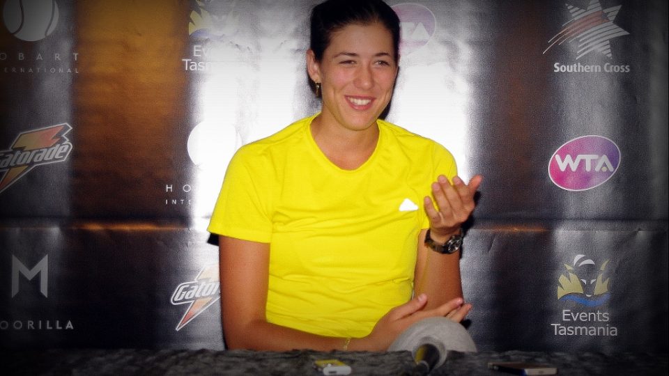 Into a career-first singles final, Garbine Muguruza can’t wipe the smile off her face in press. Picture: Casey Gardner