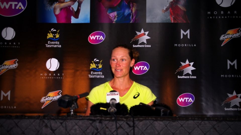 Top seed Samantha Stosur could still manage a smile in her post-match press conference. Picture: Casey Gardner