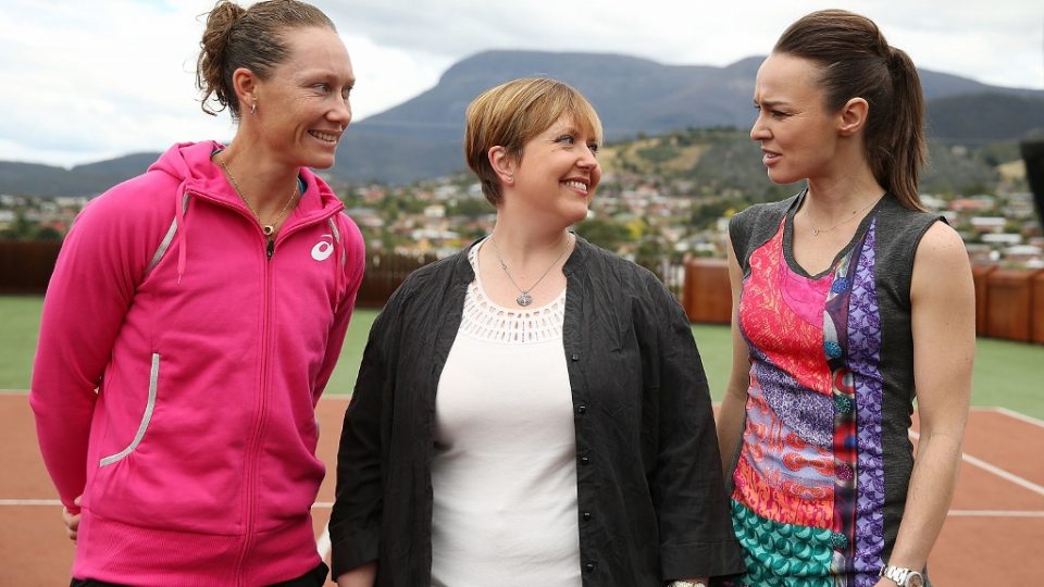 Australian number one Sam Stosur and Tasmanian Premier Lara Giddings enjoy hearing about tennis legend Martina Hingis’s experiences while on a tour of the MONA Gallery in Hobart.