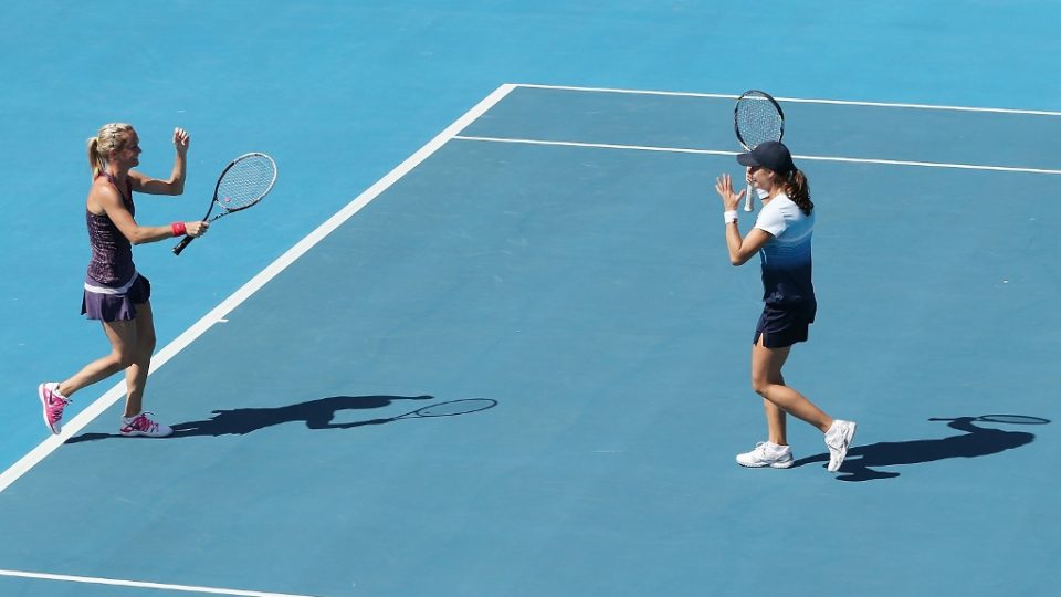 Klara Zakopalova and Monica Niculescu celebrate after winning match point. Picture: Getty Images