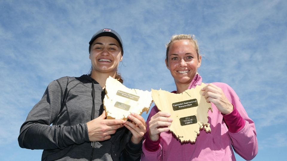 Monica Niculescu and Klara Zakopalova celebrate with their trophies. Picture: Getty Images