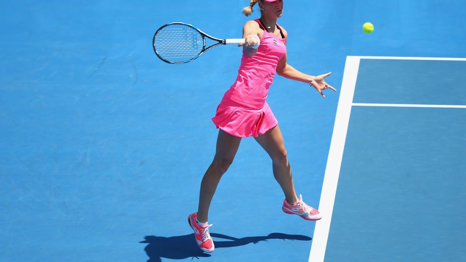 HOBART, AUSTRALIA – JANUARY 10: Denisa Allertova of Czech Republic plays a forehand in the women’s singles match against Alize Cornet of France during day one of 2016 Hobart International at the Domain Tennis Centre on January 10, 2016 in Hobart, Australia. (Photo by Robert Cianflone/Getty Images)