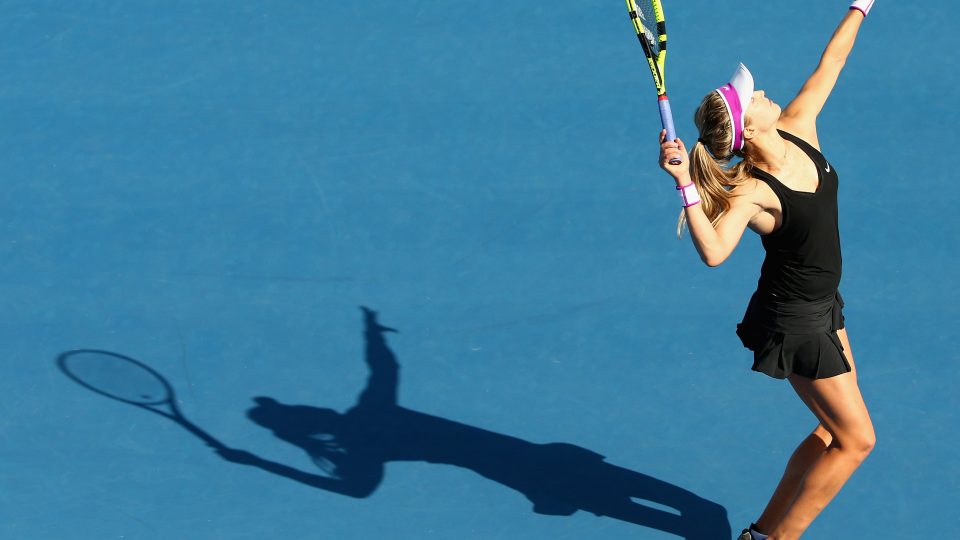 HOBART, AUSTRALIA – JANUARY 11: Eugenie Bouchard of Canada serves in the women’s single’s match against Bethanie Mattek-Sands of the United States during day two of the 2016 Hobart International at the Domain Tennis Centre on January 11, 2016 in Hobart, Australia. (Photo by Robert Cianflone/Getty Images)