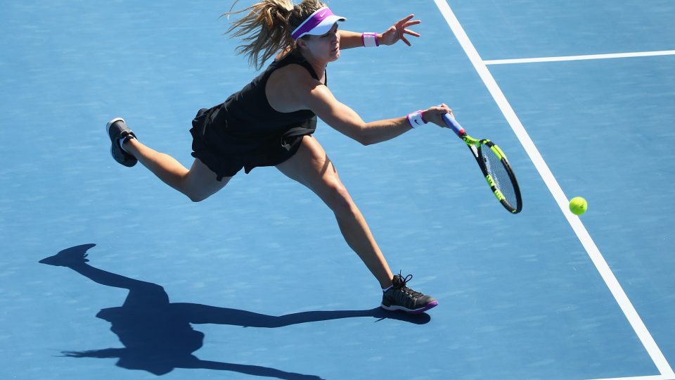 HOBART, AUSTRALIA – JANUARY 15: Eugenie Bouchard of Canada plays a forehand in her semi-final singles match against Dominika Cibulkova of Slovakia during day six of the 2016 Hobart International at the Domain Tennis Centre on January 15, 2016 in Hobart, Australia. (Photo by Robert Cianflone/Getty Images)