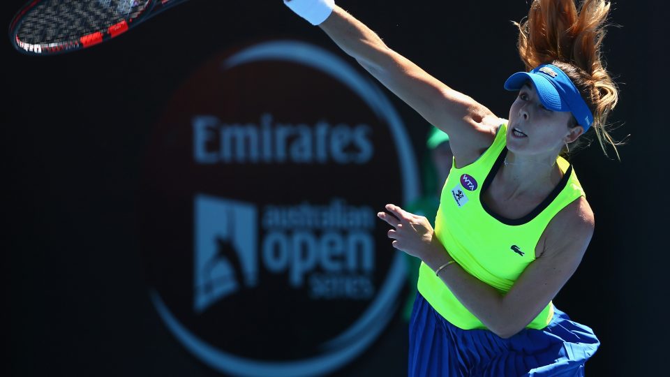 HOBART, AUSTRALIA – JANUARY 16: Alizé Cornet of France serves during the singles finals match againsts Eugenie Bouchard of Canada during the 2016 Hobart International at the Domain Tennis Centre on January 16, 2016 in Hobart, Australia. (Photo by Robert Cianflone/Getty Images)
