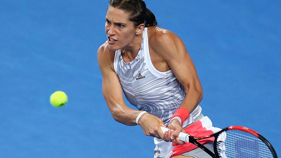 PERTH, AUSTRALIA – JANUARY 04: Andrea Petkovic of Germany plays a backhand to Belinda Bencic of Switzerland during the women’s singles match on day four of the 2017 Hopman Cup at Perth Arena on January 4, 2017 in Perth, Australia. (Photo by Paul Kane/Getty Images)