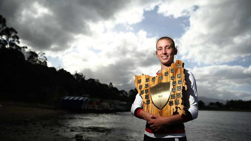 PURE JOY: Qualifier Elise Mertens craddles her first WTA title at Hobart’s Cornelian Bay; Getty Images