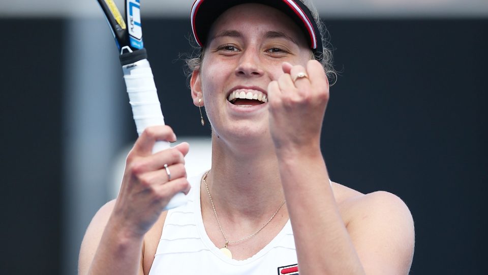 ELATION: Elise Mertens celebrates becoming the Hobart International singles champion for 2017; Getty Images