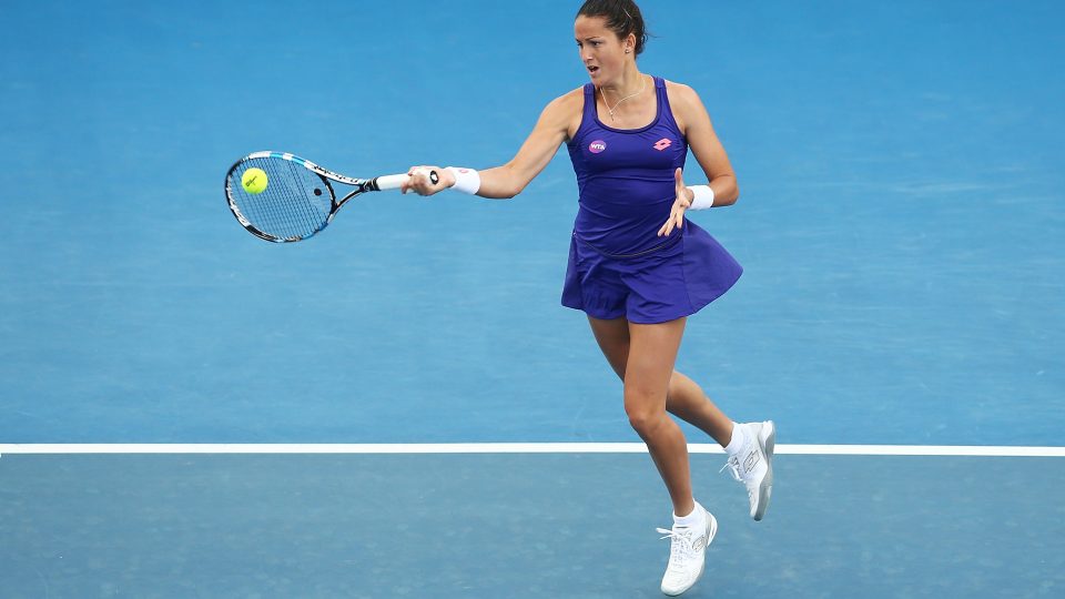 ATTACKING: Spaniard Lara Arruabarrena moves into the court as she fires a forehand during the evening session feature match; Getty Images