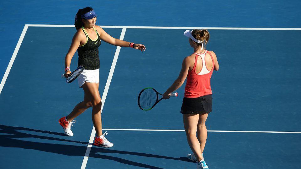 EXCITEMENT: Zhaoxuan Yang of China and Gabriela Dabrowski of Canada embrace after winning their doubles semifinal; Getty Images