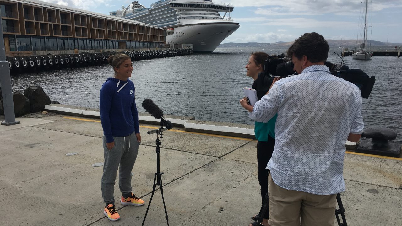 HAPPY TO BE BACK: Italian Sara Errani speaks to media at Hobart’s Constitution Dock this morning.