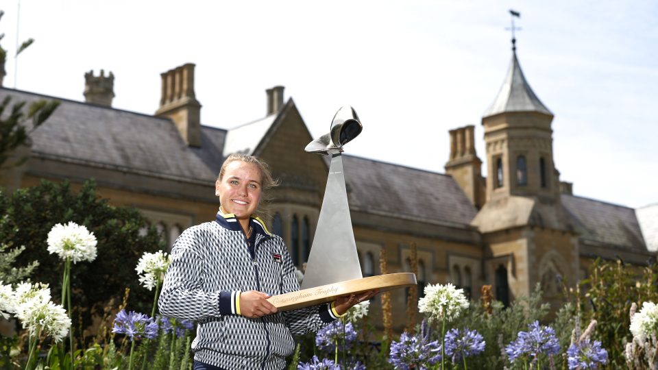 CELEBRATING: Sofia Kenin with the Angie Cunningham Trophy at the picturesque Government House in Hobart; Getty Images