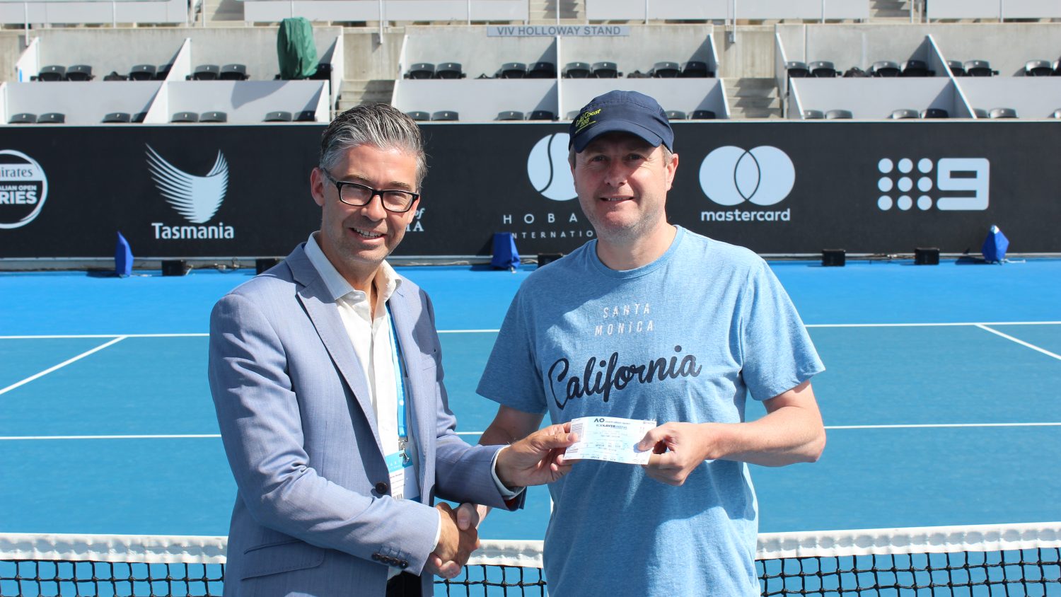 WINNER: Hobart International Tournament Director Darren Sturgess with competition winner Stuart Geeves. Picture: Joe Turmine