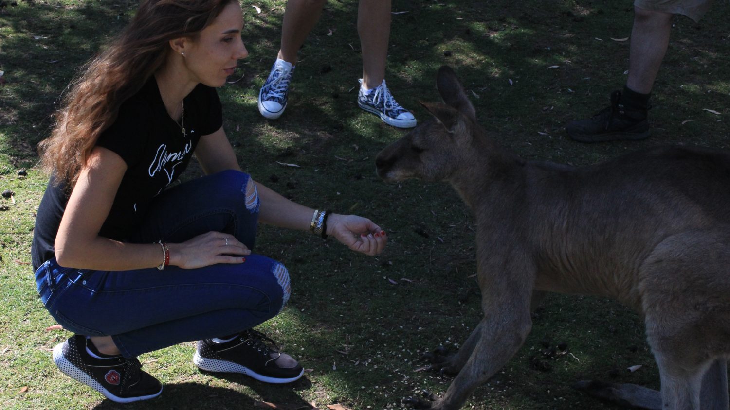 NEW FRIEND: Mihaela Buzarnescu feeds a kangaroo at Bonorong Wildlife Sanctuary. Picture: Joe Turmine
